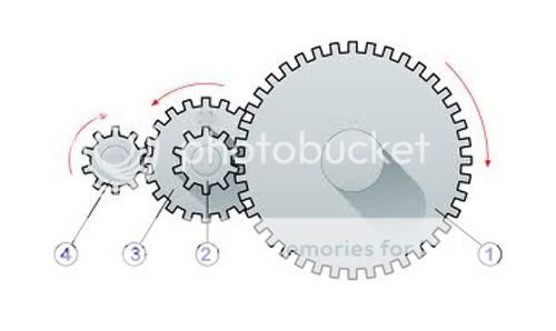 Si volem augmentar la velocitat d'un mecanisme farem servir uns quants engranatges o politges acoblades, pasant de mida més gran, a mida més petita.